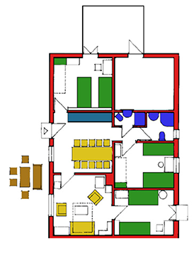 Ein Schlafzimmer mit zwei, die anderen beiden mit 3 Einzelbetten